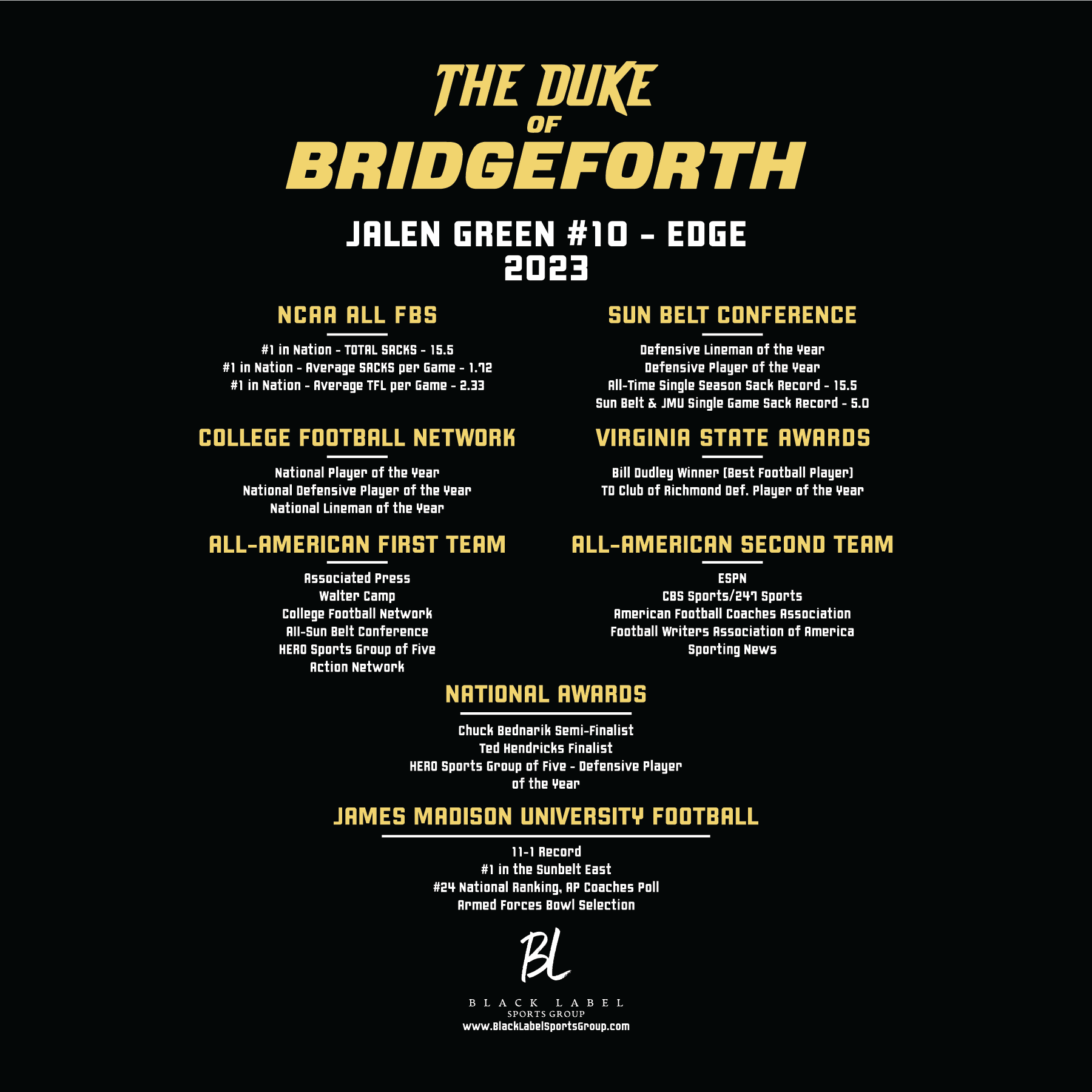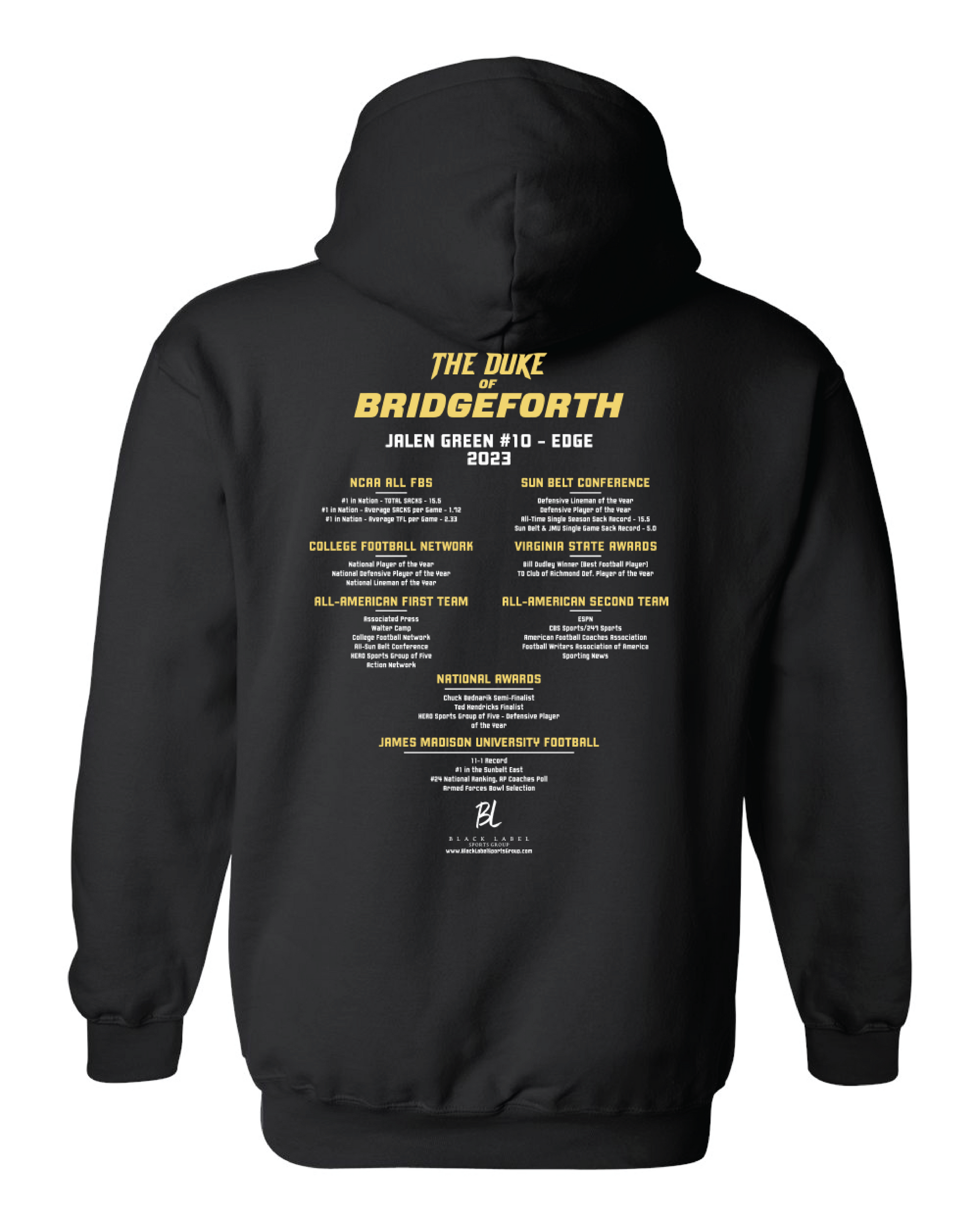 50/50 Heavyweight Hoodie with The Duke of Bridgeforth graphic on the front chest, and a back print featuring a list of Jalen's accolades and accomplishments while at JMU.
